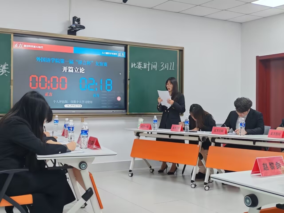 本次辩论赛围绕“语言与代码的博弈:AI时代,翻译的‘温度’能否被取代?”这一前沿议题展开,吸引了众多师生的关注与参与。在6511微格实训室内,选手们思维碰撞,妙语连珠,充分展现了语言与科技的交融魅力。